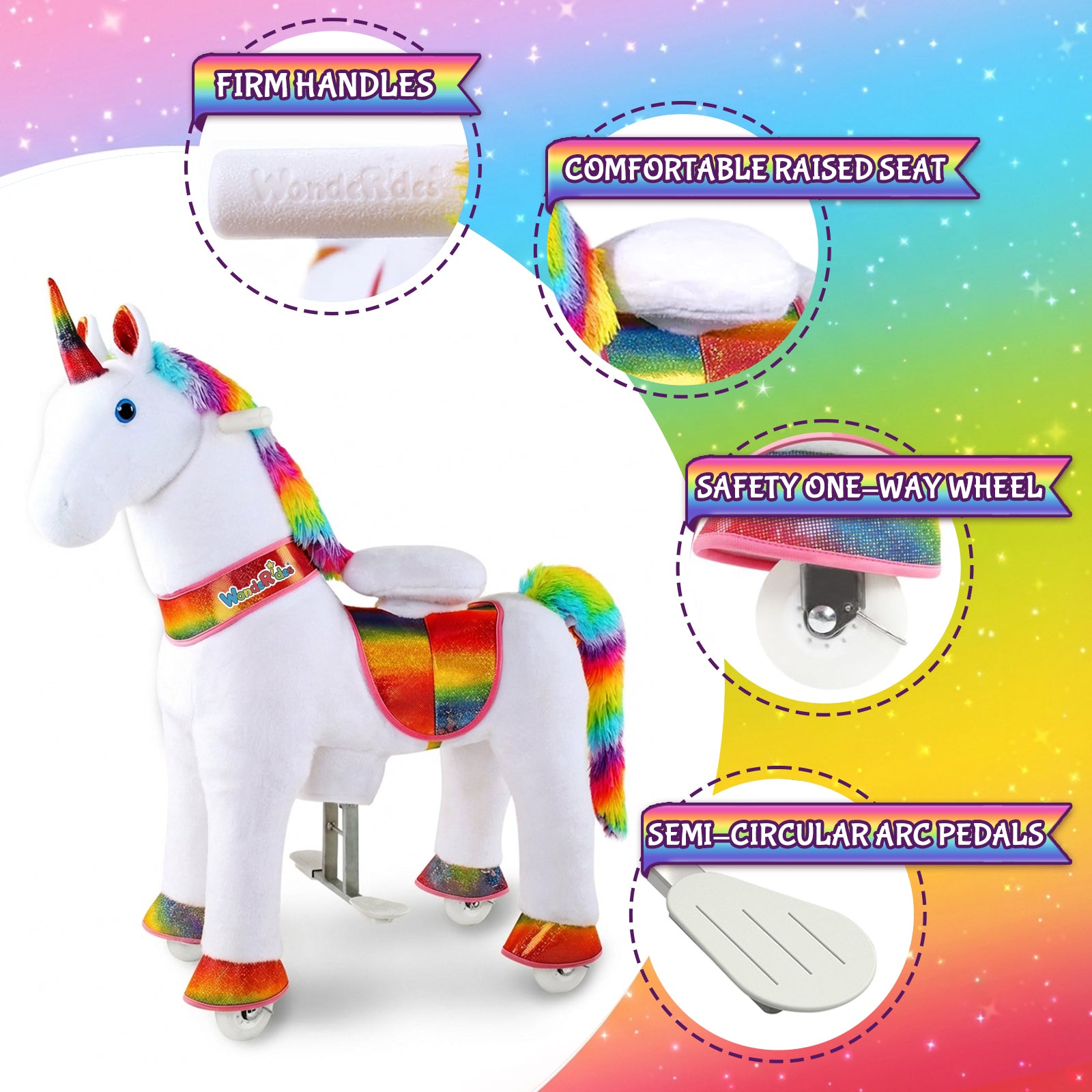 WondeRides Ride-On Horse is easy to assemble and simple for children to ride. Just step on the foot pedal to make the pony move forward and steer using the handlebar.