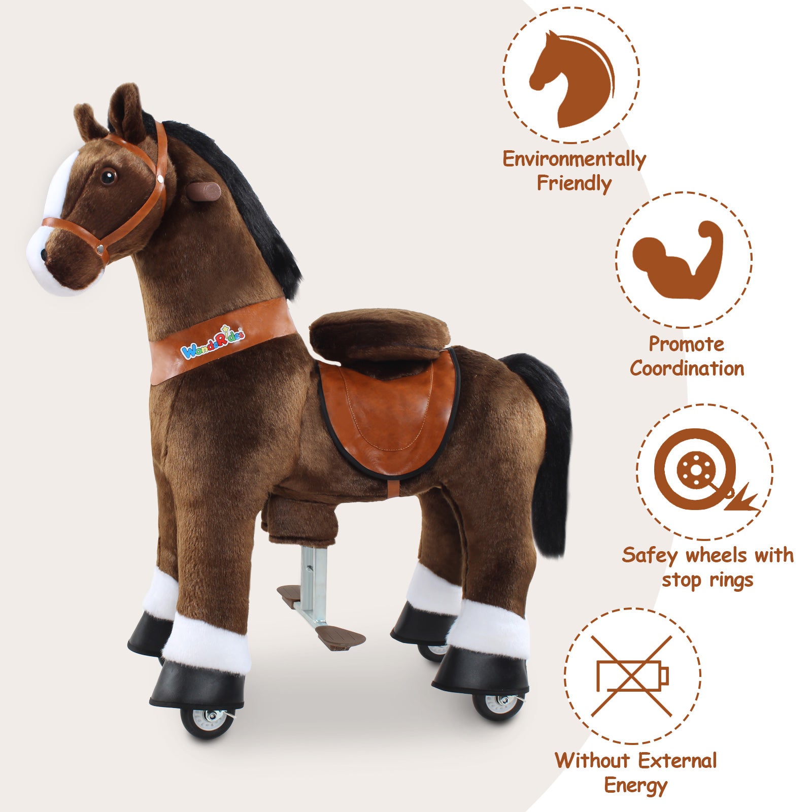 WondeRides Ride On Horse features premium soft plush fur that's eco-friendly and gentle on kids’ skin. The flame-retardant padding and solid steel frame ensure a safe, cozy ride. The advanced mechanical system lets kids feel like riding a real pony.